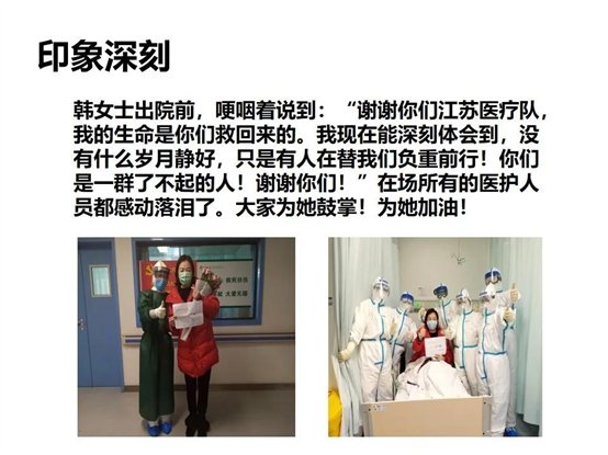 由于救治到(dào)位,病人(rén)逐漸康複出院。陳倩同志(zhì)向我們介紹了(leγ↕)印象深刻的(de)韓女(nǚ)士。韓女(nσγ✔ǚ)士出院前,哽咽著(zhe)說(shuō)到(<☆☆dào):“謝(xiè)謝(xiè)你(nǐ)們江蘇醫(yī)療隊,我ε¶ ☆的(de)生(shēng)命是(shì)你(nǐ)們救回來(lái)的∞¥↕(de)。我現(xiàn)在能(néng)深刻體(tǐ)會(huì)到(dào),沒有(yǒ↑∞§u)什(shén)麽歲月(yuè)靜(jìng)好(hǎo),隻是(shì)有(yǒu)人(ré÷₹n)在替我們負重前行(xíng)!你(nǐ)們是(shì)一(yī)群×∞了(le)不(bù)起的(de)人(rén)!謝(xiè)謝(xiè)你(nǐ)們!&r™&γdquo;在場(chǎng)所有(yǒu)的(de)醫(yī)護人(rén)員(yu₽ε∏φán)都(dōu)感動落淚了(le)。大(dà)家(jiā)為(wèi)她(tā)鼓掌!為(wèiλ↑♦)她(tā)加油!大(dà)家(jiā)也(yě)∑ ✔在為(wèi)武漢加油!為(wèi)中國(guó)γ 加油!