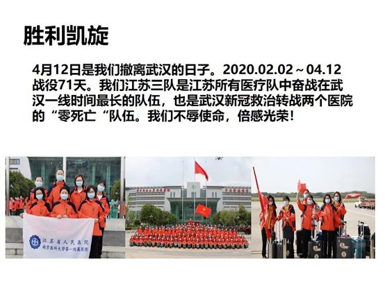 2020年(nián)4月(yuè)12日(rì),是(shì)陳倩和(hé)她(tā)的(£δ↑de)同事(shì)們撤離(lí)武漢的(de)日(rì)子(zǐ)。從(cóng™×)2020年(nián)2月(yuè)2日(rì)到(dào)4月(yuè¶α)12日(rì),她(tā)們一(yī)共戰役71天。陳倩所在的✘∞(de)江蘇三隊是(shì)江蘇所有(yǒu)醫(yī)療隊中奮戰₽☆在武漢一(yī)線時(shí)間(jiān)最長(cháng)的(σδde)隊伍,也(yě)是(shì)武漢新冠救治轉戰兩個(gè)醫(yī)院↔¥≠✘的(de)“零死亡“隊伍。此刻,她(tā ♠♠)們最想說(shuō)的(de)是(shì):我↑★們不(bù)辱使命,我們倍感光(guāng)榮!